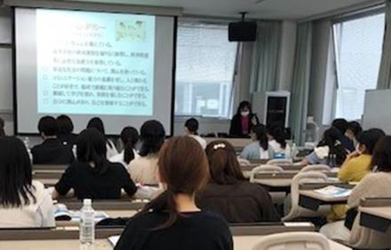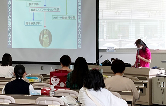 木村准教授より看護学科の説明を行いました。その後、在宅看護領域の藤川講師による「“住み慣れた家で看護や医療を受けられる”在宅看護の魅力」をテーマに模擬講義が行われました。看護師の働く場は多様になってきていること、在宅で療養を希望する対象者を支えるための看護について、社会背景も交えながらの講義となりました。生徒さんの真剣なまなざしが印象的でした。
