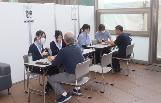 この教室は、選手、大会関係者や一般来場者に健康管理や体力づくり及び健康づくりの啓発を行うもので、垂直跳び、棒反応時間、全身反応時間の測定やヘモグロビン、血圧の測定を行い、測定結果に対する現状の分析や健康相談を行いました。