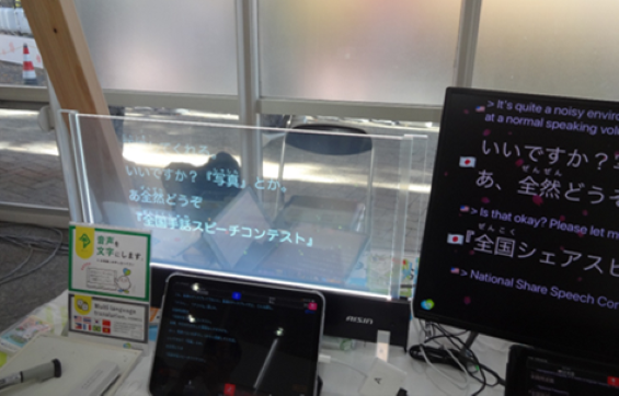 11月24日、人間福祉学部の手話サークルに所属する学生3名と教員が観戦と応援に行ってきました。最初に国立オリンピック記念青少年総合センターで開催された「デフリンピックスクエア」を見学しました。会場には国際手話を学ぶコーナーやデフスポーツ体験コーナーなどいろいろなコーナーが設けられ見学者で賑わっていました。特に目を引いたのは「デジタル技術展示・体験ブース」でした。透明のディスプレイを真ん中に置き言葉が即時に文字となって表示される端末や、手話を読み取って文字にするものなど、デジタル技術を使ったコミュニケーションツールの開発に驚きました。