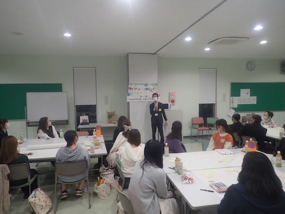 11月27日(木)、各務原市こども政策課主催の「カフェほいく」を、16:50~各務原キャンパスの新学生ホールで行いました。カフェほいくは、保育のことをもっと知りたい高校生や大学生が、公立保育者のみなさんと一緒におしゃべりし、「保育」という仕事の魅力について語り合う交流会です。高校生が8名、子ども教育学科学生が18名、現場の先生方4名の参加で、4グループに分かれて「どんな子に育ってほしいですか?」というテーマでの交流、そして「保育者に何でも質問コーナー」の2部で、和気あいあいとお話をしました。学生は緊張気味でしたが、保育者のみなさんが話を笑顔で受け止め、意見をまとめたり、学生の素朴な相談にのったりと、徐々に笑顔と活気あふれる会になり、あっという間の時間でした。最後は今回のテーマに沿って、アドバイザーの梅田先生から、実体験や絵本を用いてのコメントが行われました。「保育者になることを決めました!」と語った学生もいたようで、大変充実した会になったようです。引き続きこうした現場の先生方との交流を大切に、保育の魅力を発信していきます!
