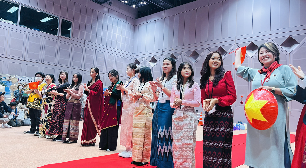 KIA フェスティバルでのミャンマー展示ブース。学生たちが伝統衣装を着て、文化や観光地を紹介し、国際交流を深めました。
