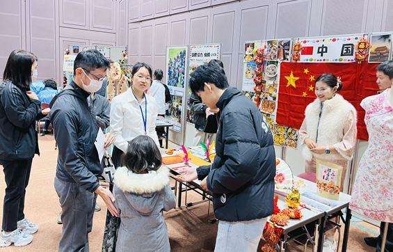 At the Chinese booth, Chinese international students are introducing their culture while interacting with visitors