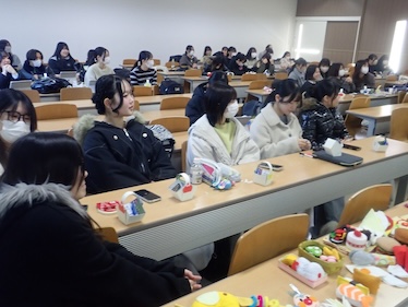 1月21日の子ども教育学科幼稚園教諭・保育士コース1年生の「保育現場参観」最終授業では、岐南さくら認定こども園の先生方をお招きし、様々な実践を通して保育への考え方を学びました。緊張していた学生も、先生の歌に合わせて手を叩きあうなどするうちに、知らない間に保育者としての表現ができるようになっていきました。手作りおもちゃでは、子どもの発達を考えながら保育者が願いを込めて作成することの大切さを教えていただきました。また、牛乳パックで節分の豆を入れるカバンの作成では、安全で、幼児が楽しく作ることのできる援助の方法について、子どもと保育者双方の視点から考えていくことの大切さを教えていただきました。初めての幼稚園教育実習が1月26日から始まります。本コースでは、これからも様々な方法を通して、充実した実習になるようサポートしてまいります。