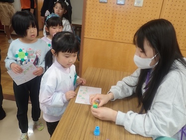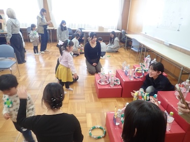 2つ目のブースは「あかりをつけましょ ぼんぼりに♪」です。ここではペットボトルや折り紙、テープなど豊富な素材を用意し、ぼんぼり作りの製作活動を行いました。子どもたちは自分の好みに合わせて色を選びながら、完成を楽しみにし、わくわくした気持ちで製作に取り組んでいました。完成後は部屋を暗くし、ライトの上に置くことで色がより鮮やかに浮かび上がり、子どもたちの表情には笑顔と驚きがあふれていました。