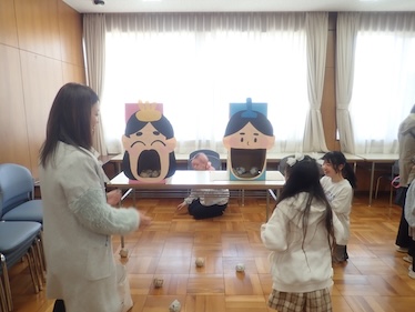 3つ目のブースは「レッツ おかざり」です。ここでは、ひな祭りについて学びながら、お雛様とお内裏様をめがけてボールを入れる遊びを行いました。子どもたちは一生懸命ボールを投げ入れ、カラフルなボールによってお雛様やその周りが華やかに彩られていきました。
