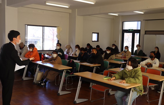 2021年12月14日(火)昼休み、関キャンパスにおいて、キャリア支援センター事務課による留学生就職セミナーを開催しました。セミナーには、人間福祉学科3年生と社会福祉学科1年生の留学生25名が参加し、日本の就職活動の特徴や日本独特の就職慣行をはじめ、留学生が知らない情報の集め方などについてアドバイスを受けました。また、求人応募から書類選考、採用試験、内定通知に至るまでの就職活動の流れなどについても、詳しく説明を聴くことができました。留学生は、今回のセミナーで学んだことを活かし、就職活動に励みます。