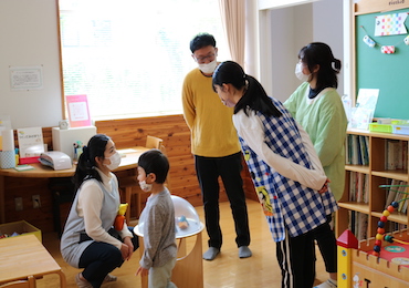 子ども教育学科 幼稚園教諭・保育士コースでは、全国的にも珍しい地域子育て支援実習を体験できます。この実習は時間的にゆとりのある4年生大学だからこそ、地域の子育て支援に対する理解や手立てを学び、保育に対する幅広い専門性を身につけてもらいたいという願いで実施しています。各務原キャンパスの校内には子ども家庭支援センター(ラ・ルーラ)があります。