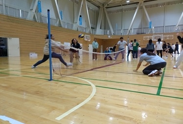 有川一先生の「スポーツ実技(体つくり運動)」の受講生と留学生が一緒に体を動かしました。「プレルボール」「ホットポテト」「パンサーボール」「王様ドッヂ」という4つのボール遊びを体験しました。なかなかスポーツをする機会がない留学生に体を動かしてもらうことが目的でしたが、教室では見ることができない一面を見せてくれました。